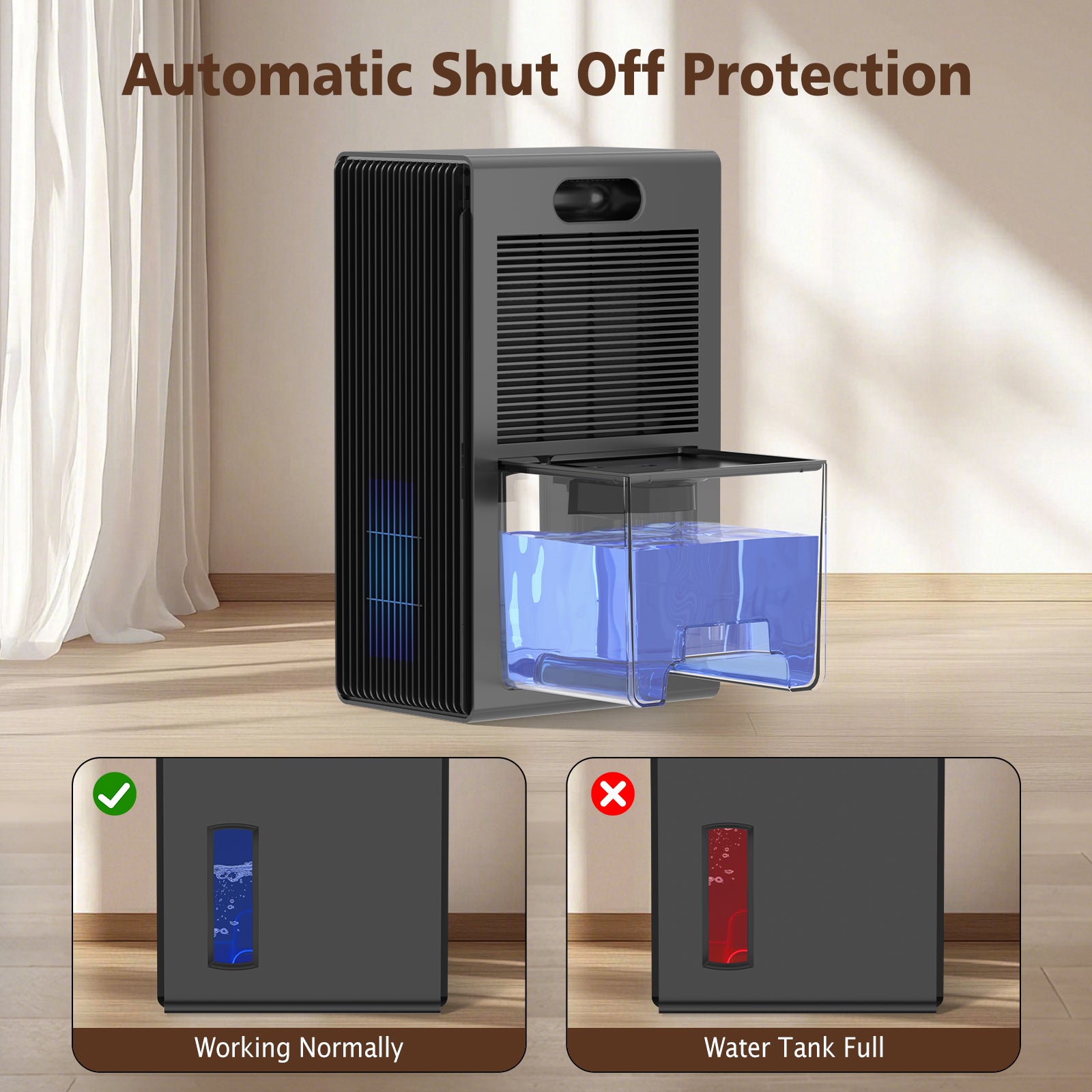 - AUTO SHUT OFF: Worry-free operation! Our dehumidifier automatically shuts off when the water tank is full or incorrectly positioned. This prevents spills and offers added safety and convenience, especially when you're not home.